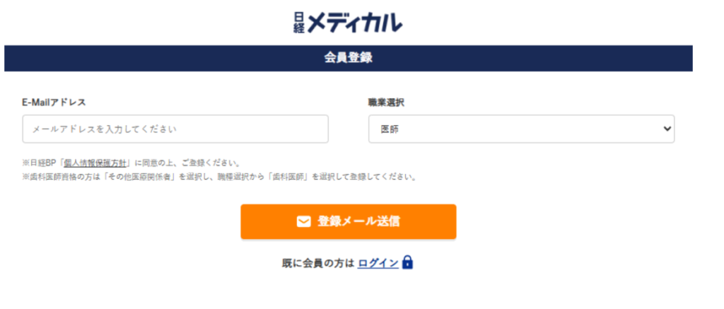 日経メディカルオンラインの登録情報がそのまま使えるので、日経メディカルオンラインに登録後、登録を進めるのがおすすめです。