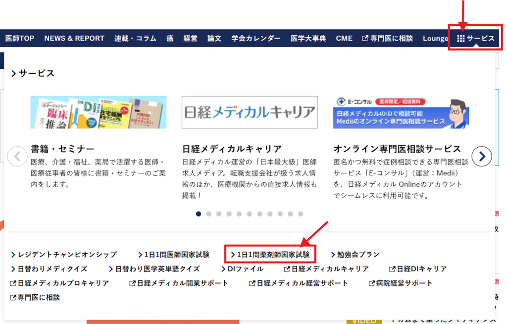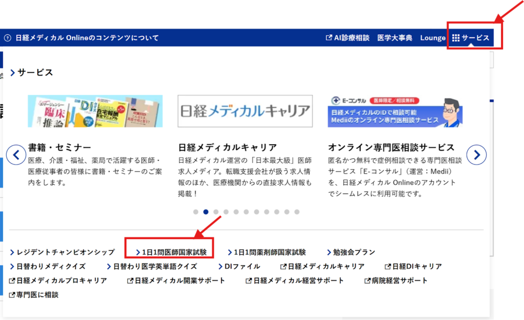 トップページの右上の「サービス」から、「1日1問医師国家試験」にアクセスして、クイズに挑戦しましょう。