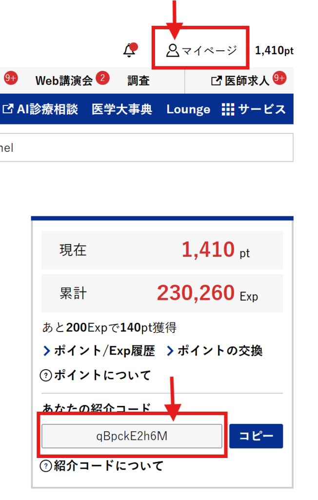 知り合いの医師を紹介してキャンペーンコードを入力してもらうことで2,000ポイントもらえます。